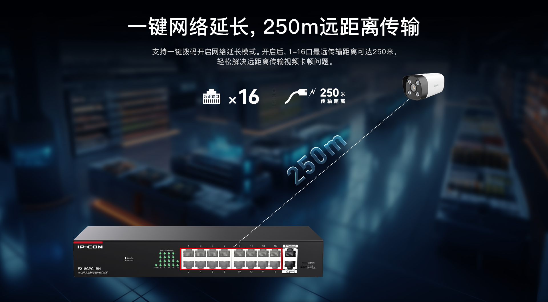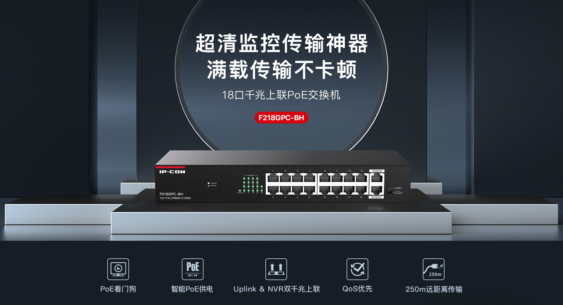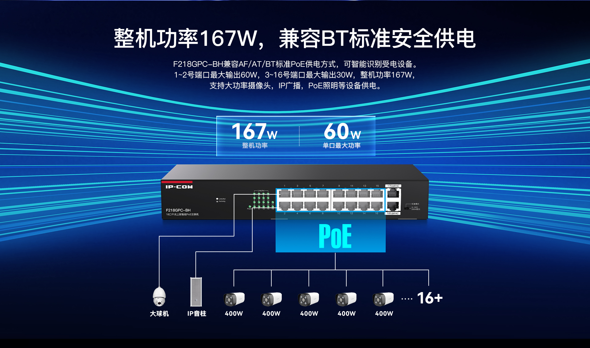 F218GPC-BH是IP-COM自主设计的一款16口百兆2口千兆上联非网管PoE交换机。兼容AF/AT/BT标准PoE供电方式,智能识别受电设备。1~2口PoE最大输出60W,3~16口PoE最大输出30W,整机167W。支持机架安装,支持PoE看门狗、智能功率控制、网络延长等功能,专为监控组网需求打造,是中小企业、便利商超、街边餐饮视频监控组网的理想选择。