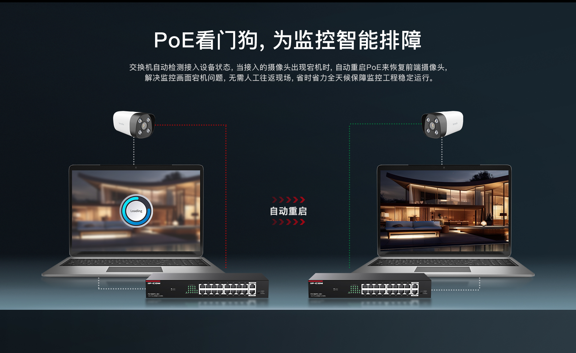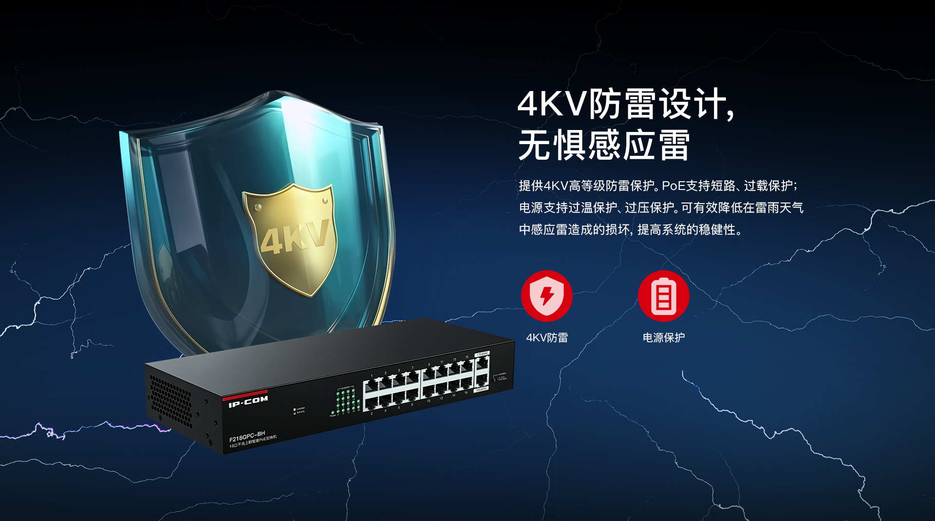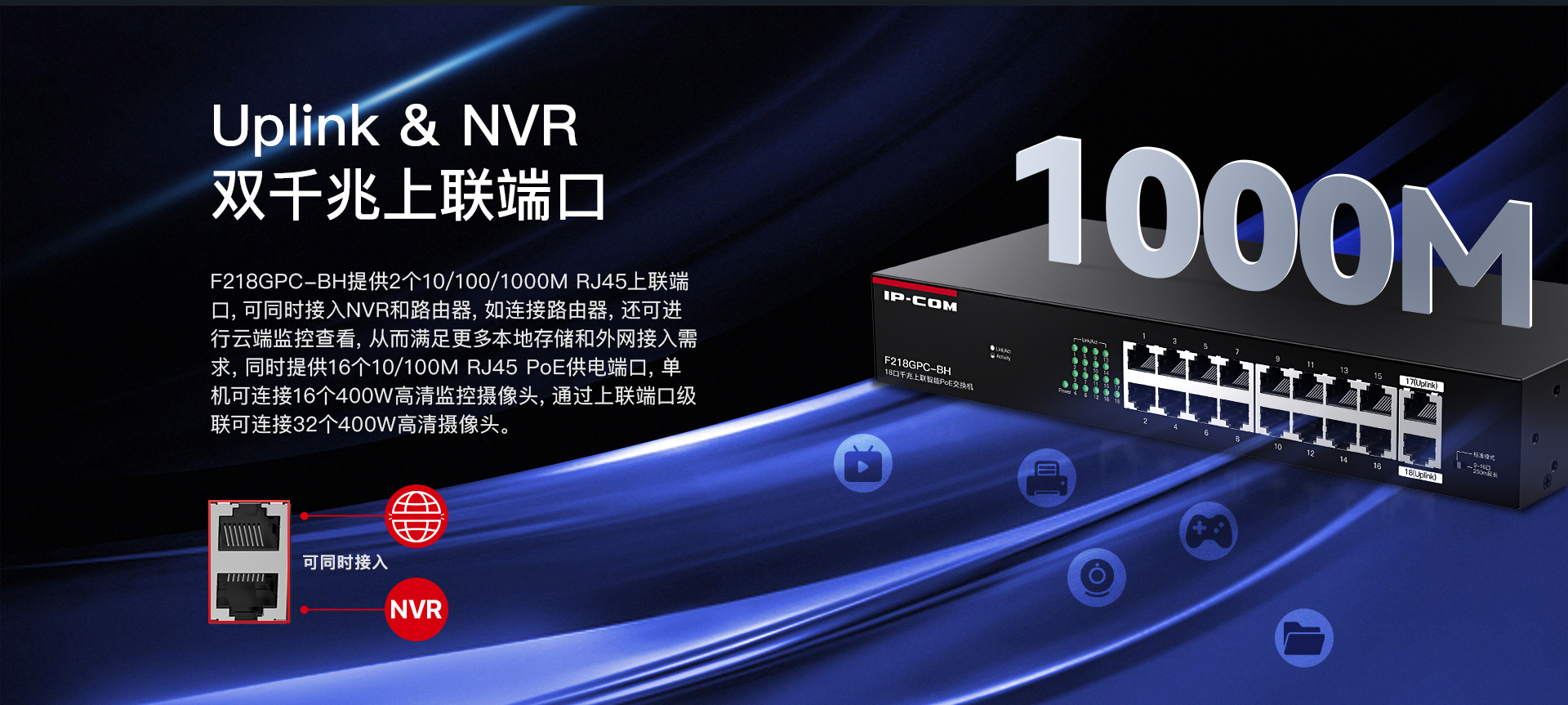 F218GPC-BH是IP-COM自主设计的一款16口百兆2口千兆上联非网管PoE交换机。兼容AF/AT/BT标准PoE供电方式,智能识别受电设备。1~2口PoE最大输出60W,3~16口PoE最大输出30W,整机167W。支持机架安装,支持PoE看门狗、智能功率控制、网络延长等功能,专为监控组网需求打造,是中小企业、便利商超、街边餐饮视频监控组网的理想选择。